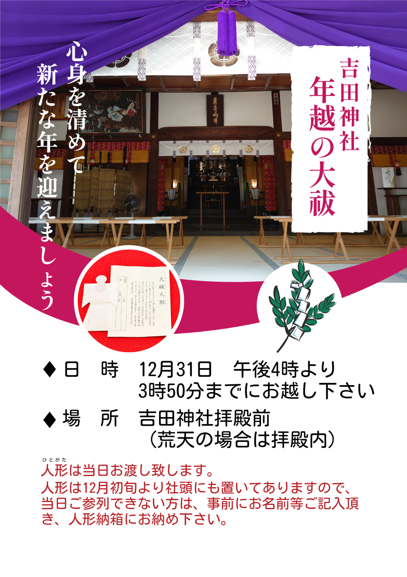 ※当日参列がかなわない方は、12月より授与所にて人形(ひとがた)をご用意しておりますので、事前に人形納箱にお納め下さい。