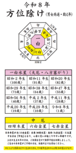 令和8年、本命星である「一白水星」が中央に位置し、八方を全て塞がれた八方塞がりの年廻りの方は以下の通りです。